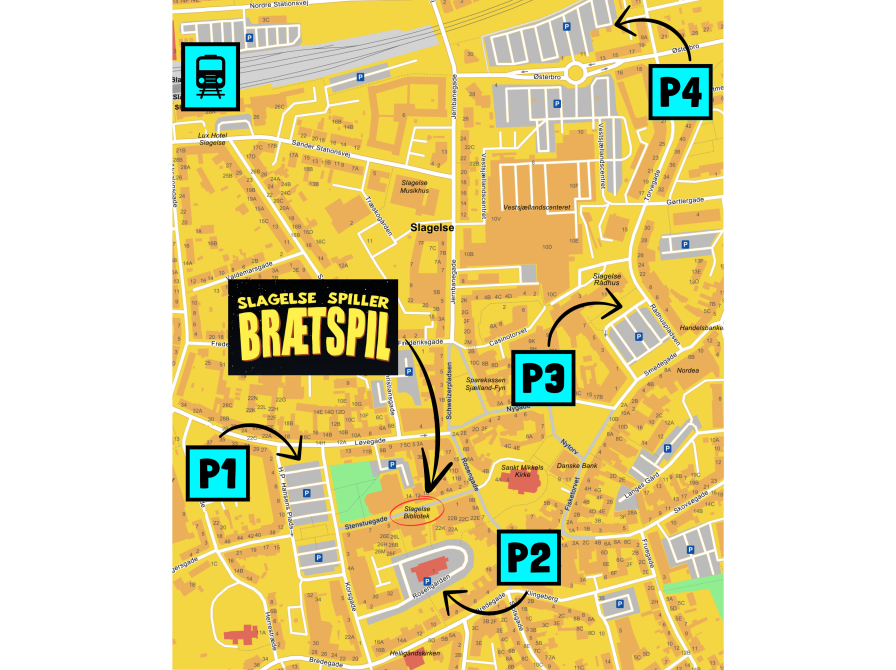 På kortet her kan du se, de parkeringspladser, der er tættest på, og også to alternativer, hvor du kan holde længere tid parkeret. Alle ligger i gåafstand (max. 800 meter) fra Slagelse Bibliotek: